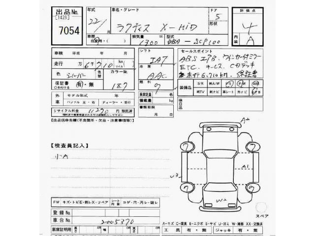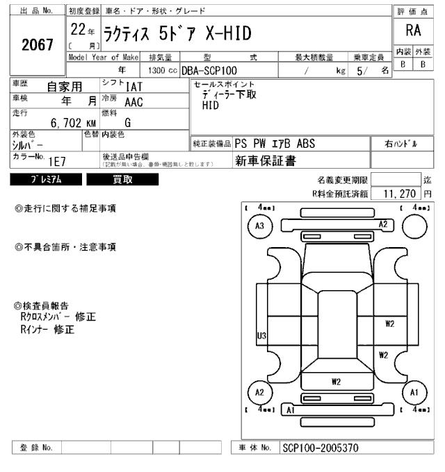 2) На автоаукционе ARAI Bayside выставлялся Рактис с оценкой RA, восстановленный после удара в заднюю часть и с 3-мя крашеными элементами, продался за 555 тыс. йен. Через некоторое время эта же машина появляется на автоаукционе Ju Gifu с оценкой 4 балла и продается за 638 тыс. йен, из крашеных элементов остался только бампер, а про аварию уже нет ни слова…
