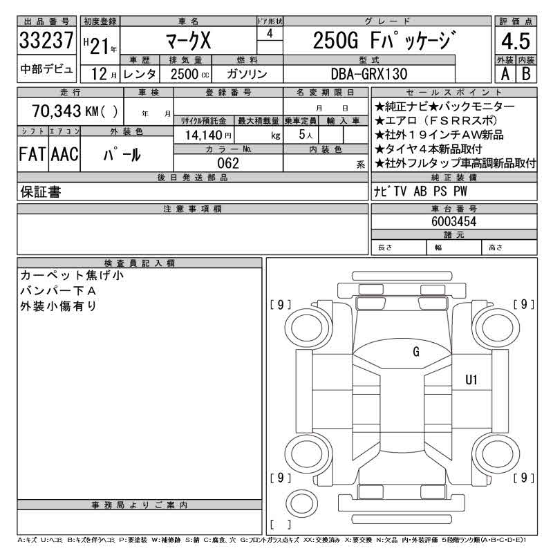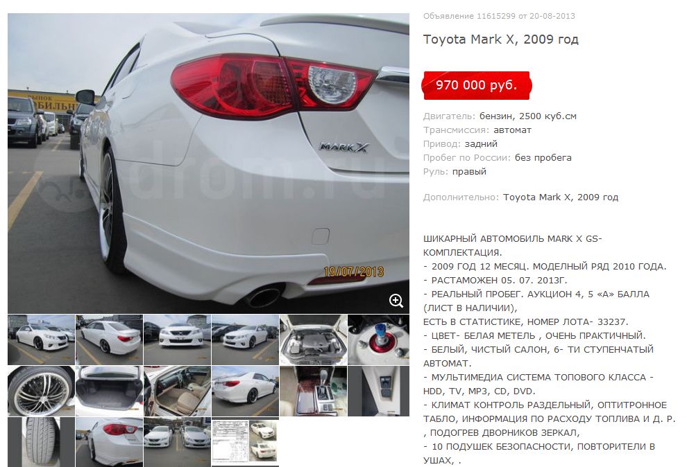 1) Марк Х в простенькой комплектации выставляется на автоаукционе USS Nagoya с оценкой 4 балла, весь в мелких царапинах и с пострадавшим передним бампером. Он успешно продается за 1.010 млн. йен и, буквально, через неделю в очередной раз выставляется на торги уже на другом автоаукционе - CAA Chubu, с новыми бамперами, колесами, спойлером и с отполированным кузовом без следов царапин. Красоту оценили, и Марк Х уже продается намного дороже, за 1.215 млн. йен.